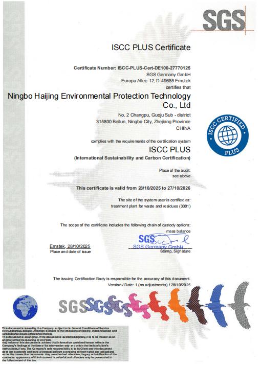 近日,寧波海靖環(huán)保科技有限公司憑借在油污水資源化利用領(lǐng)域的突出優(yōu)勢,正式通過國際權(quán)威機(jī)構(gòu)的嚴(yán)苛審核,成功斬獲ISCC(可持續(xù)發(fā)展與碳認(rèn)證)國際認(rèn)證證書。作為油污水及廢礦物油資源化利用行業(yè)首家獲得此項認(rèn)證的企業(yè),這一成果標(biāo)志著公司在可持續(xù)生產(chǎn)、碳足跡管理領(lǐng)域已達(dá)到國際領(lǐng)先水平,為公司向歐盟等國際客戶提供含油污水處理服務(wù)奠定了關(guān)鍵資質(zhì)基石。